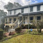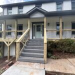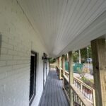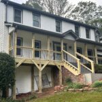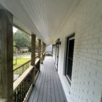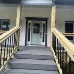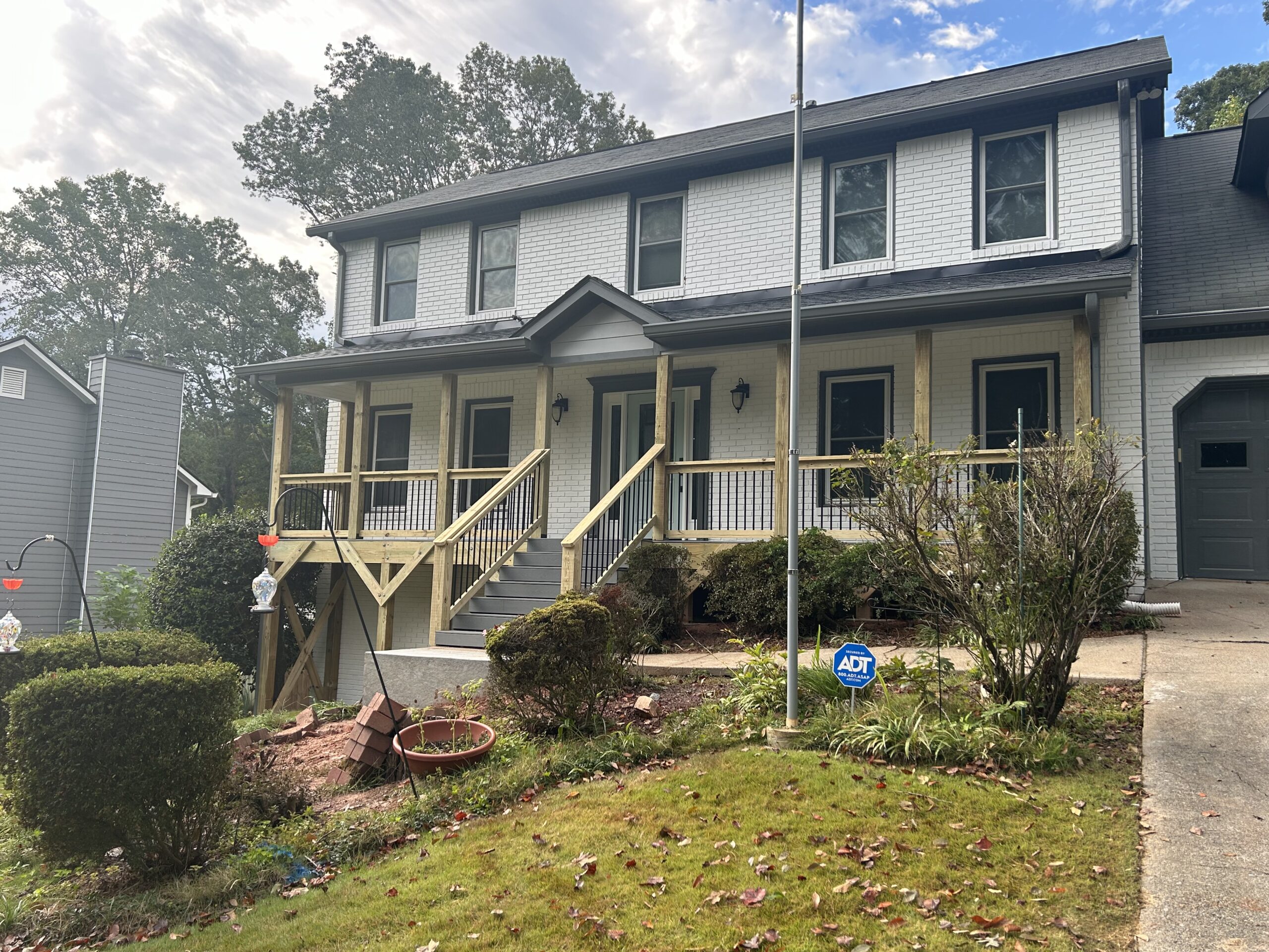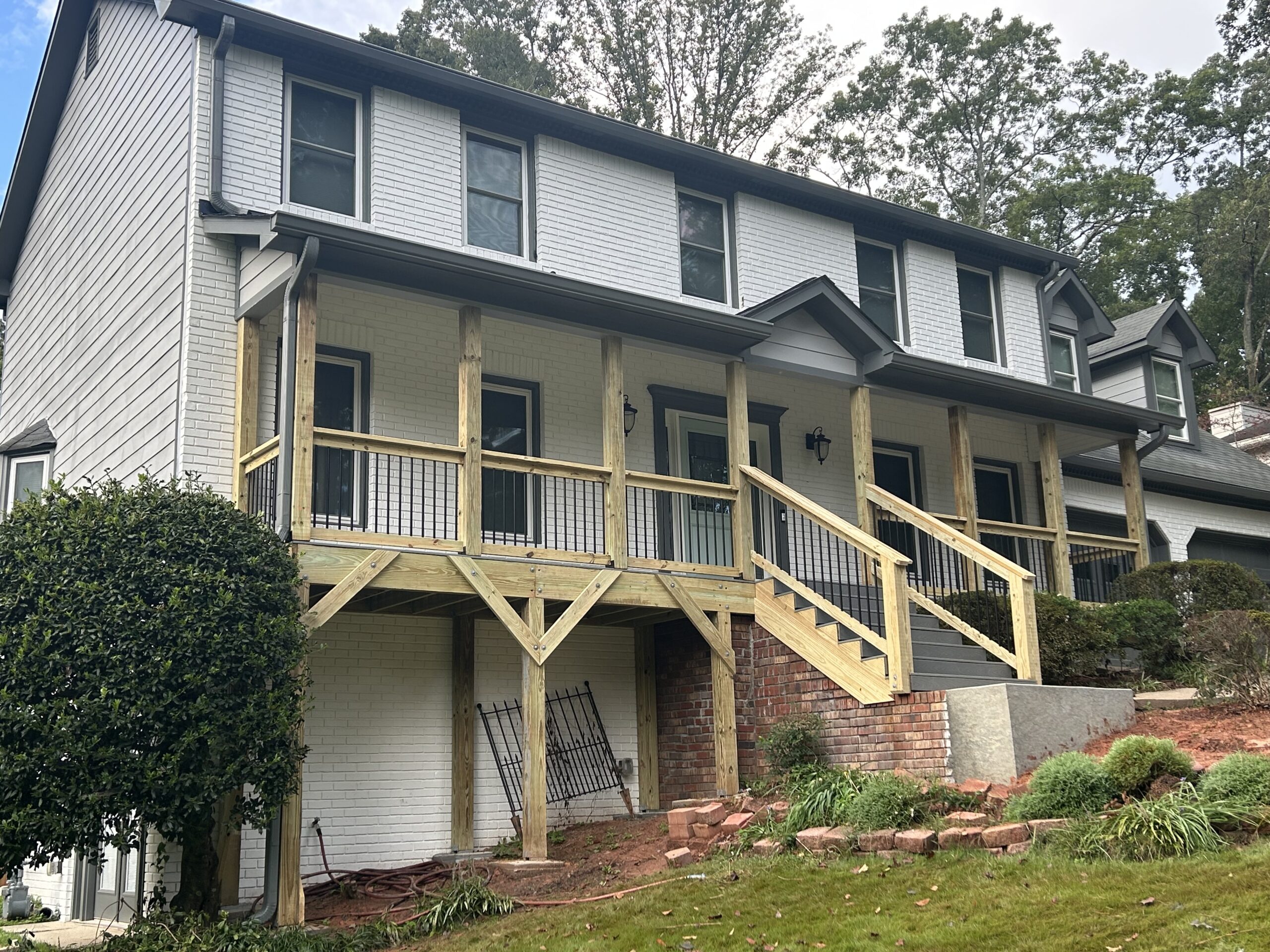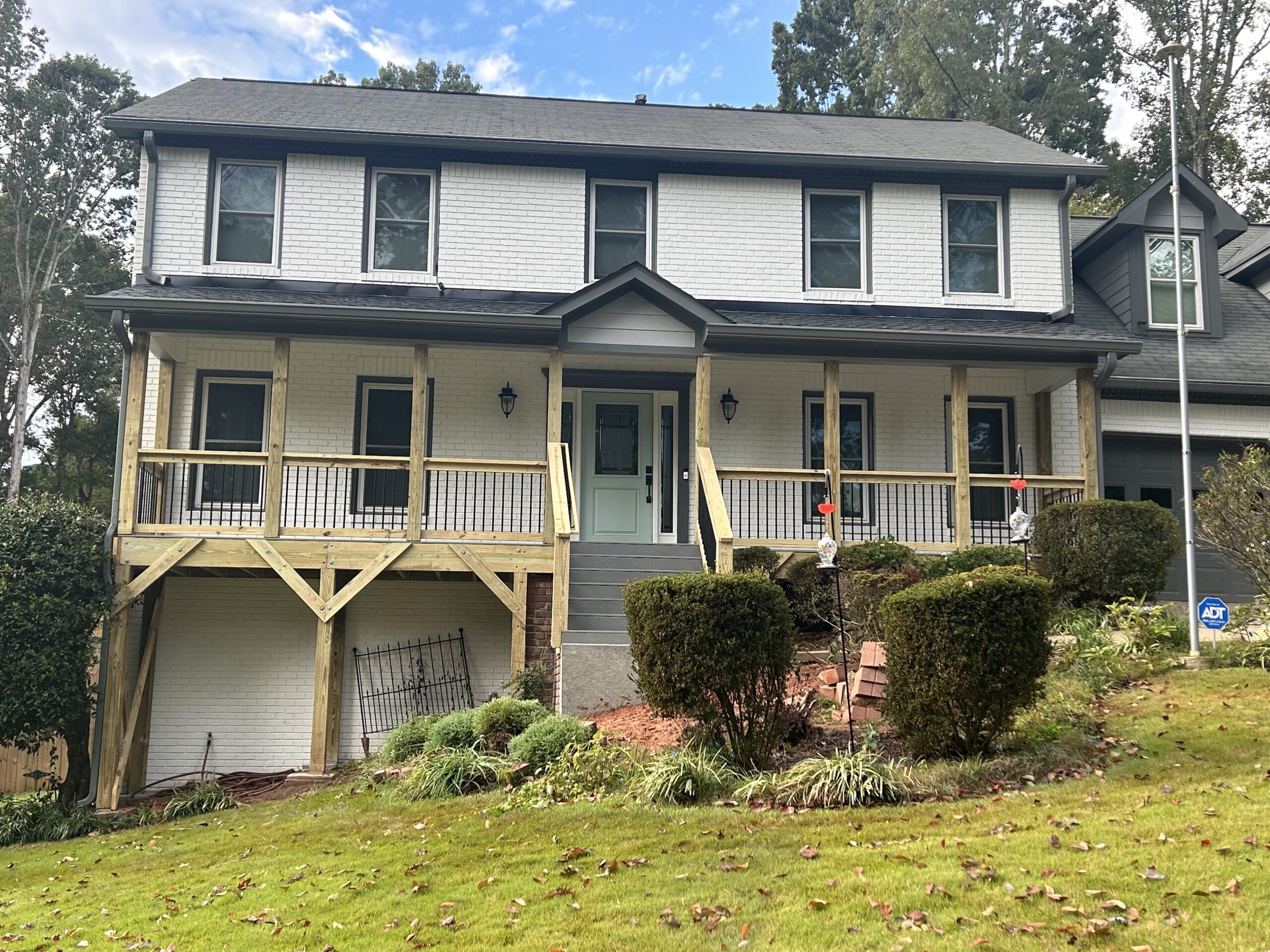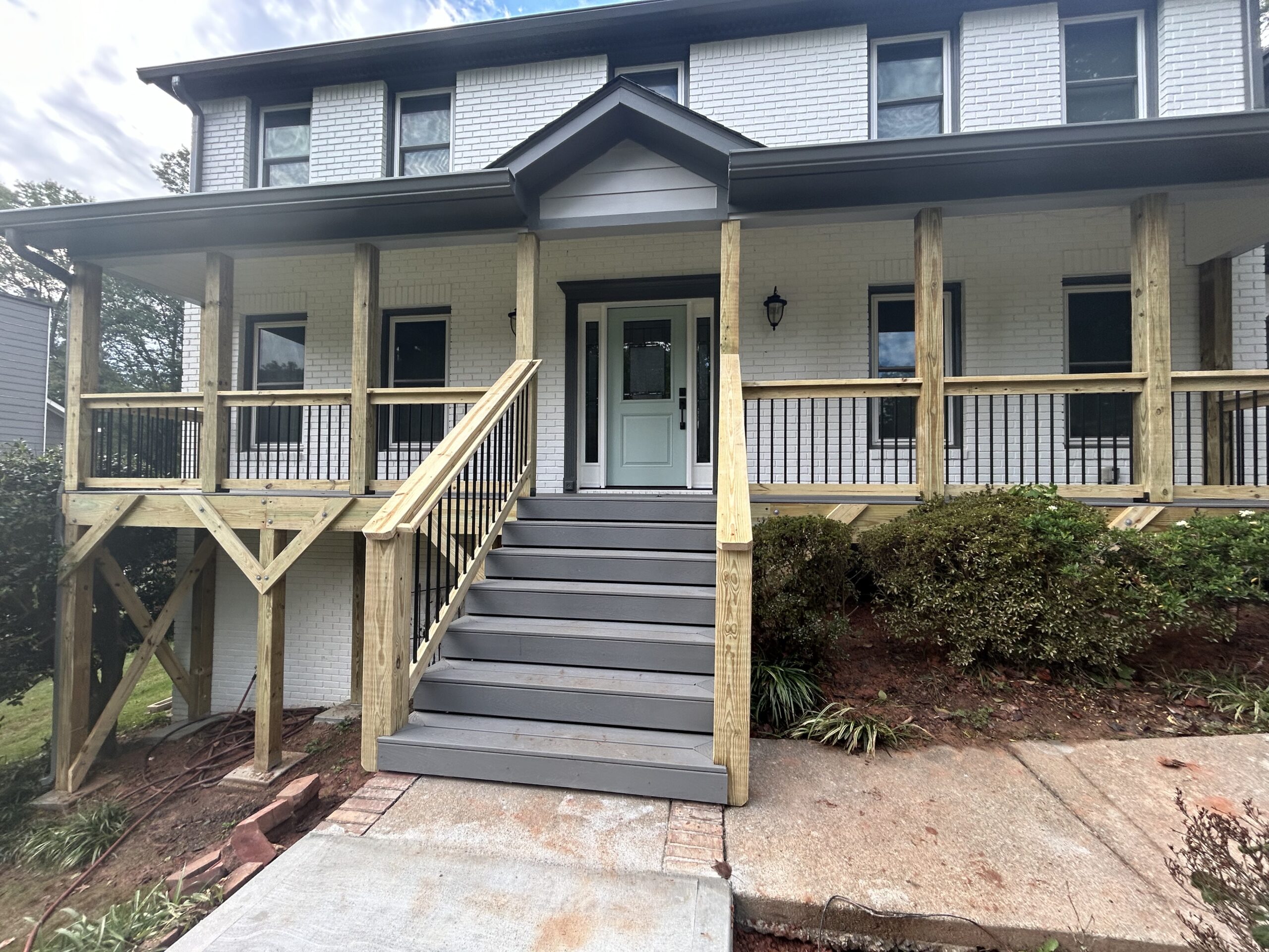 Removed concrete front porch and theee layers of brick. Built 35’x5’ front porch (freestanding due to the house being brick). Built shed roof over front porch, installed trex decking and rails with round metal balusters. Ran electrical to move an outlet into the deck. Poured new landing to extend the existing one. Painted and installed seamless gutters.