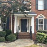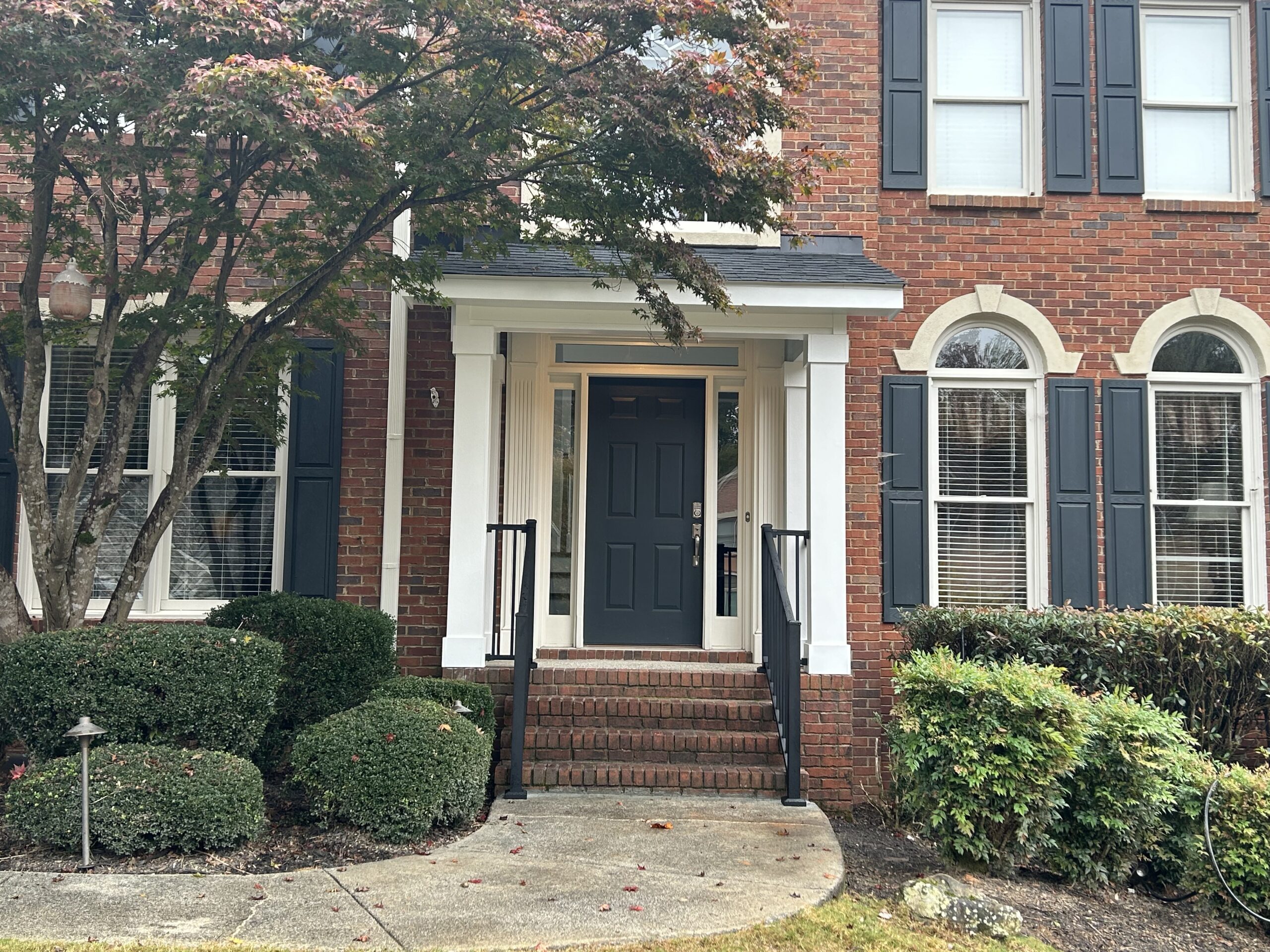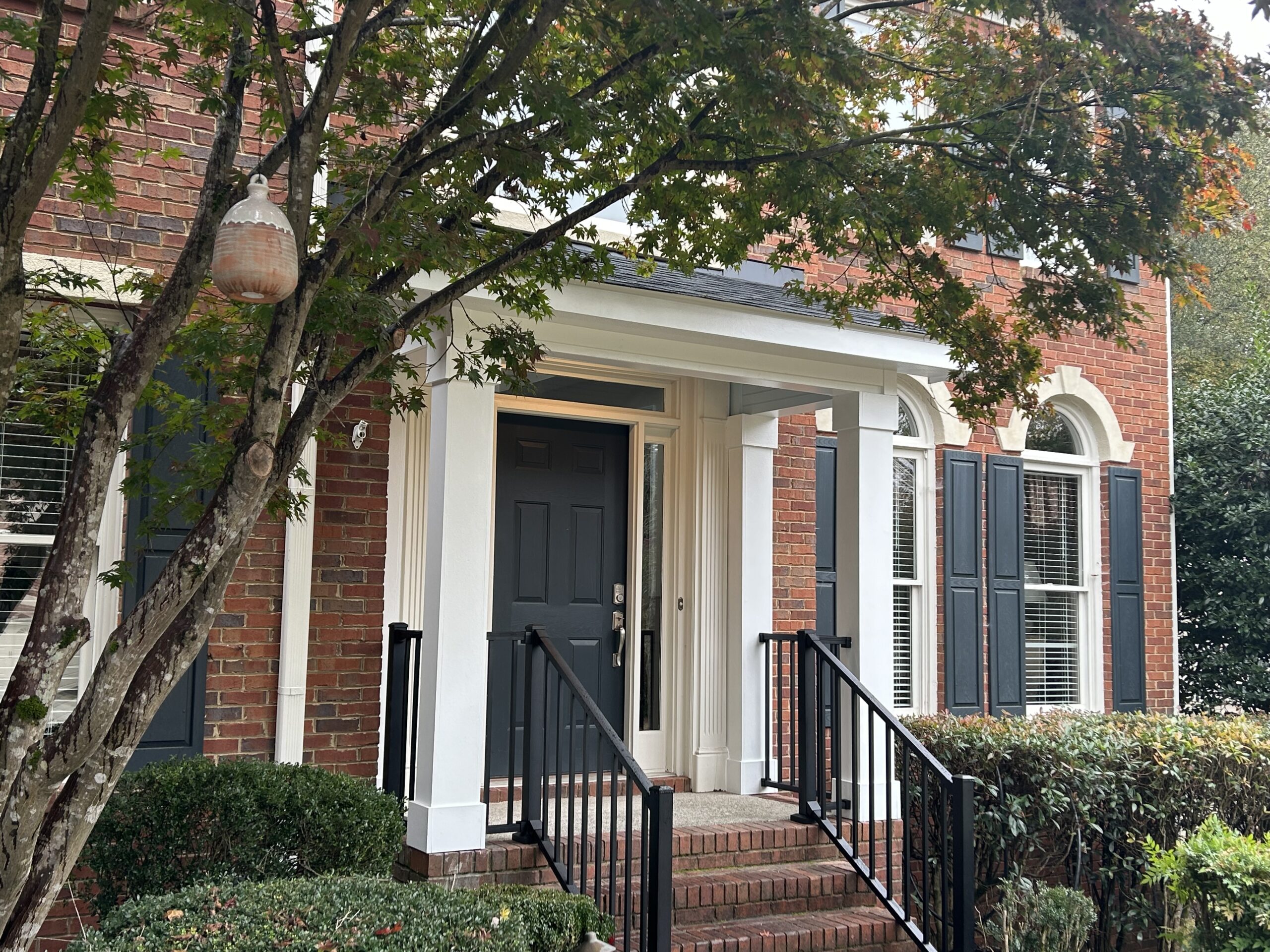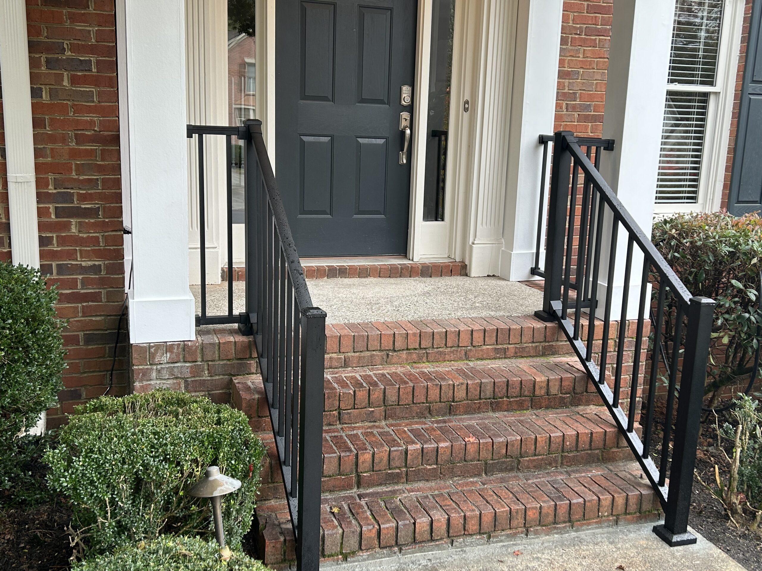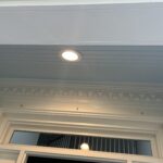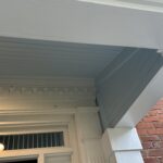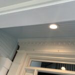 Built shed roof over 8’x4’ front porch. Ran electrical for one can light. Installed hard lap siding, trim, fascia and soffit on outside and tongue & groove on the ceiling. Painted exterior white and ceiling little boy blue. Installed metal handrails.