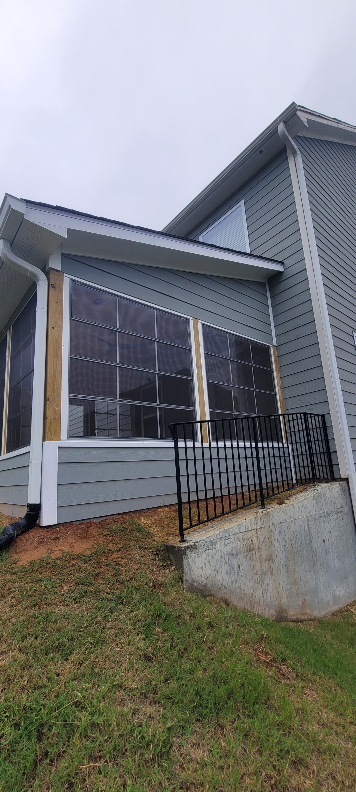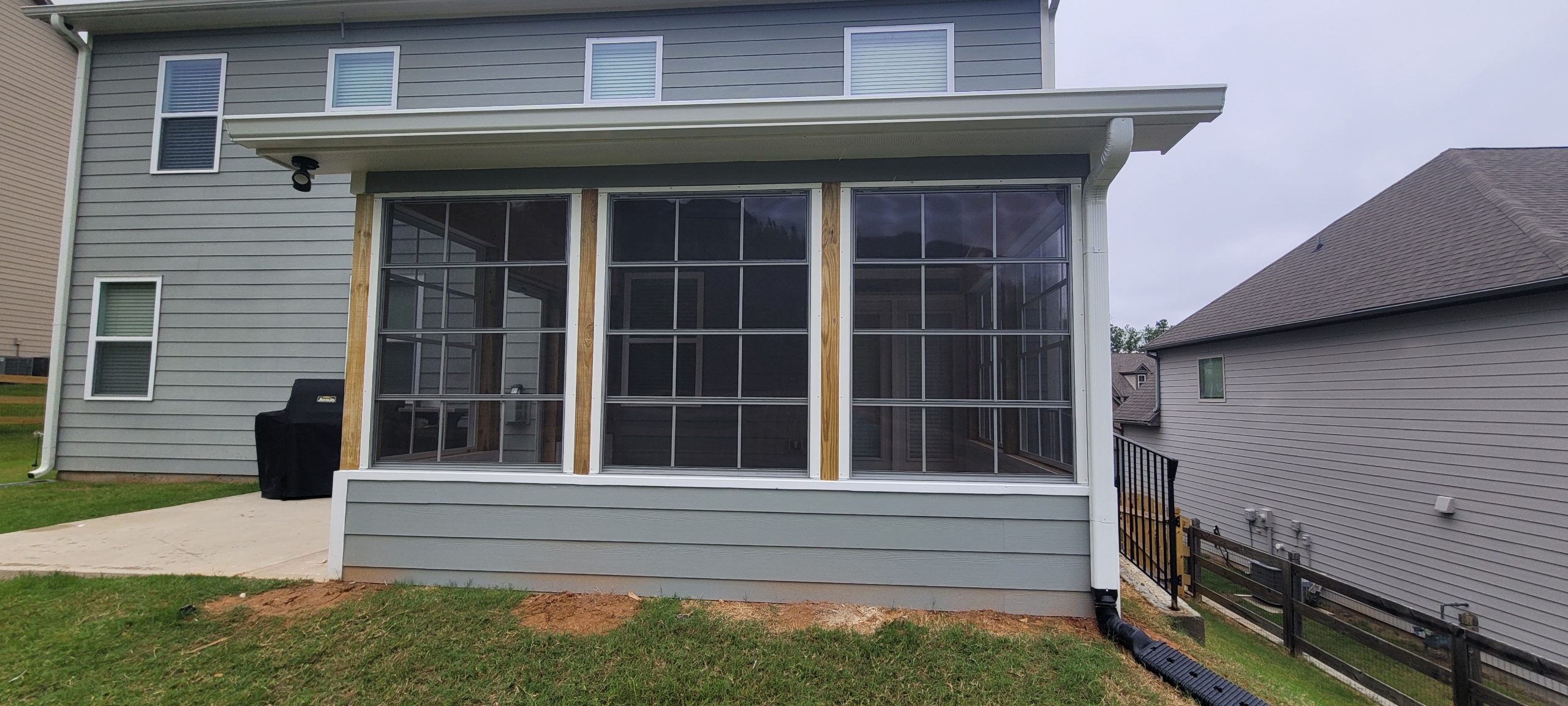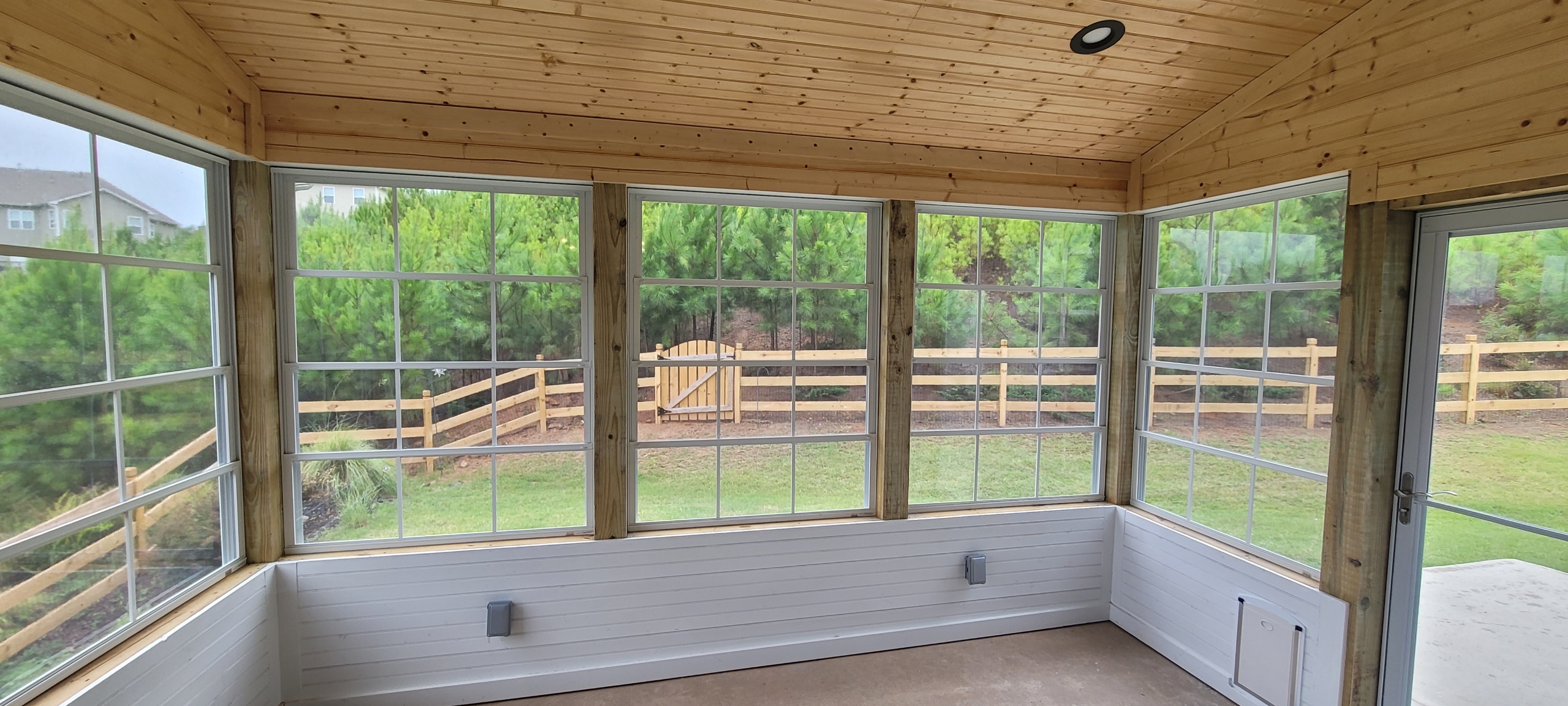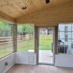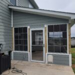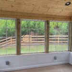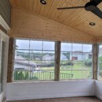 Built shed roof over 14’x12’ area. Framed walls for EZE Breeze windows. Ran electrical for three outlets, four can lights, one ceiling fan and one flood light. Install hardi siding, trim, fascia and soffit on the exterior, painted to match the residence. Installed tongue & groove on ceiling and knee wall. Painted the knee wall white and clear coated the ceiling. Installed seamless gutter, shingles to match the residence, outlets, can lights, flood light and fan.