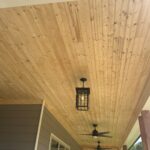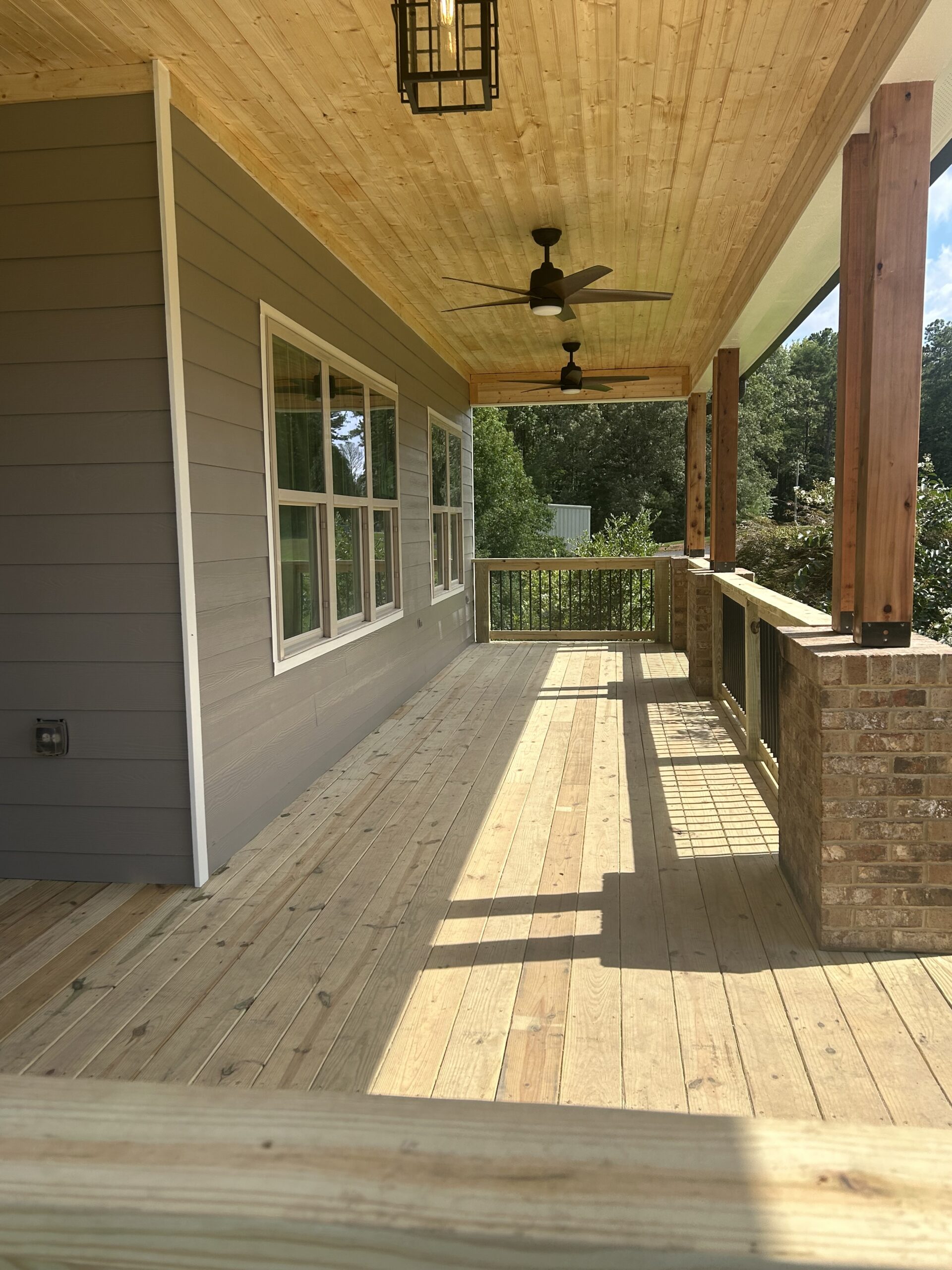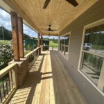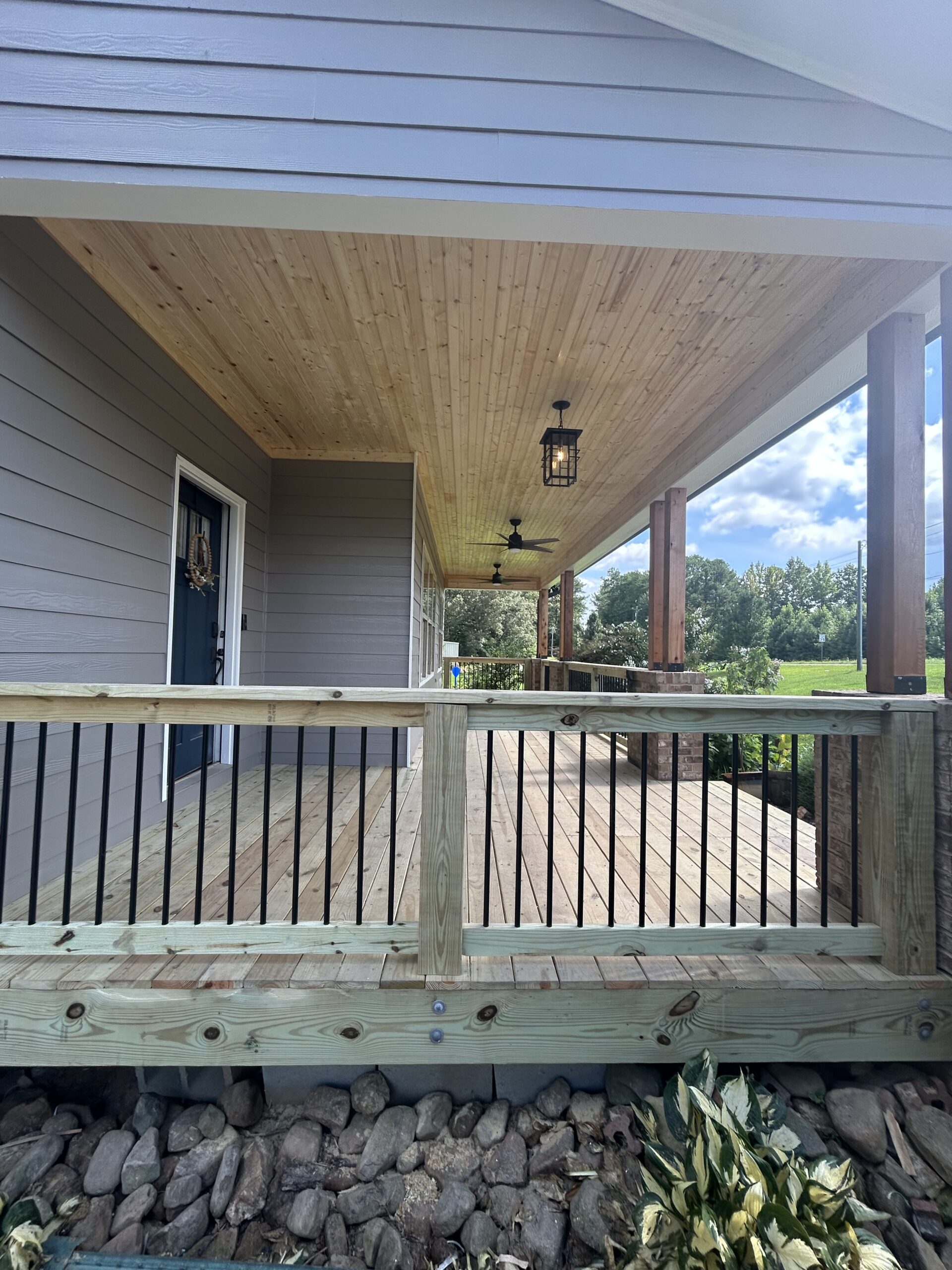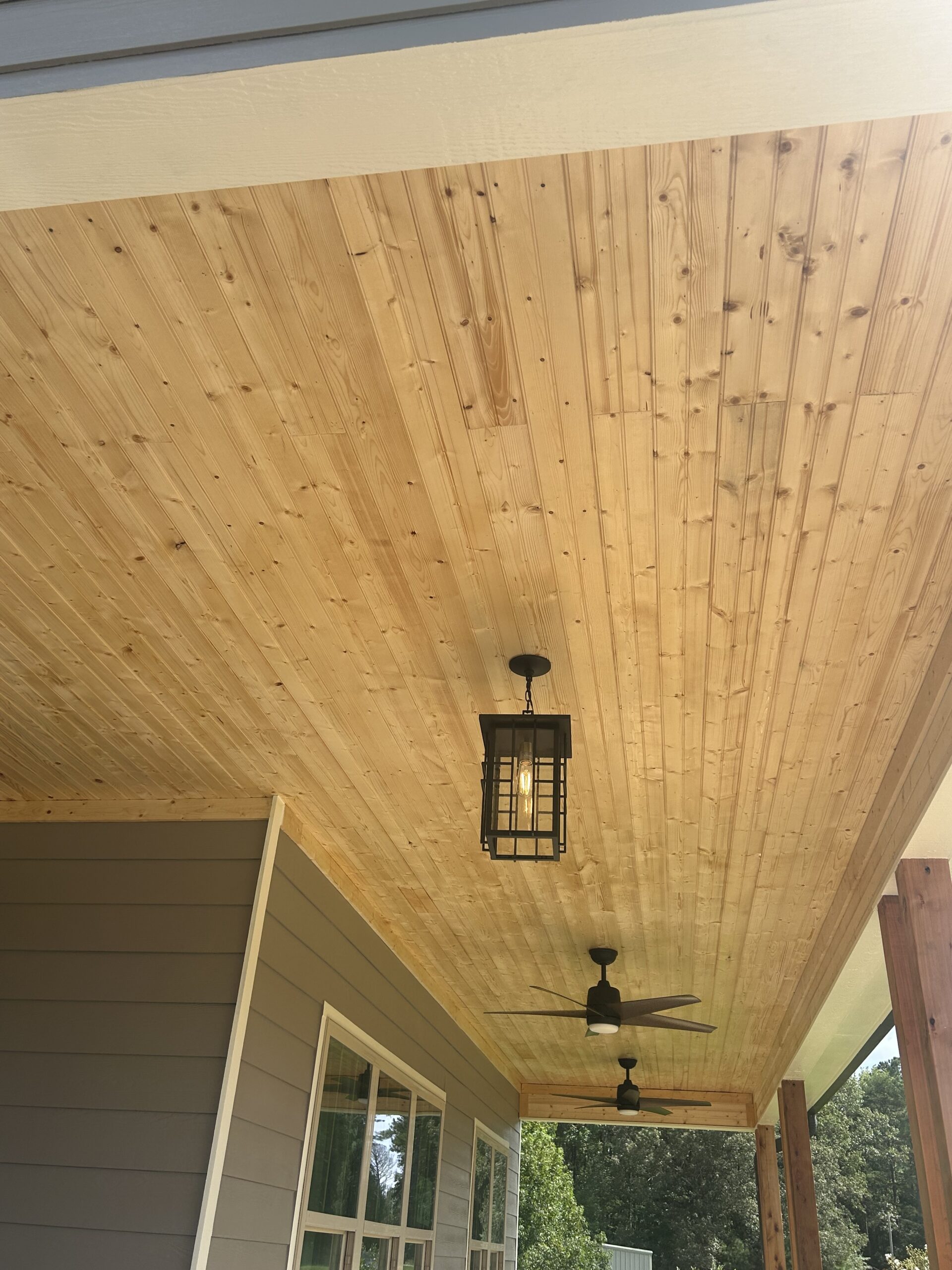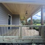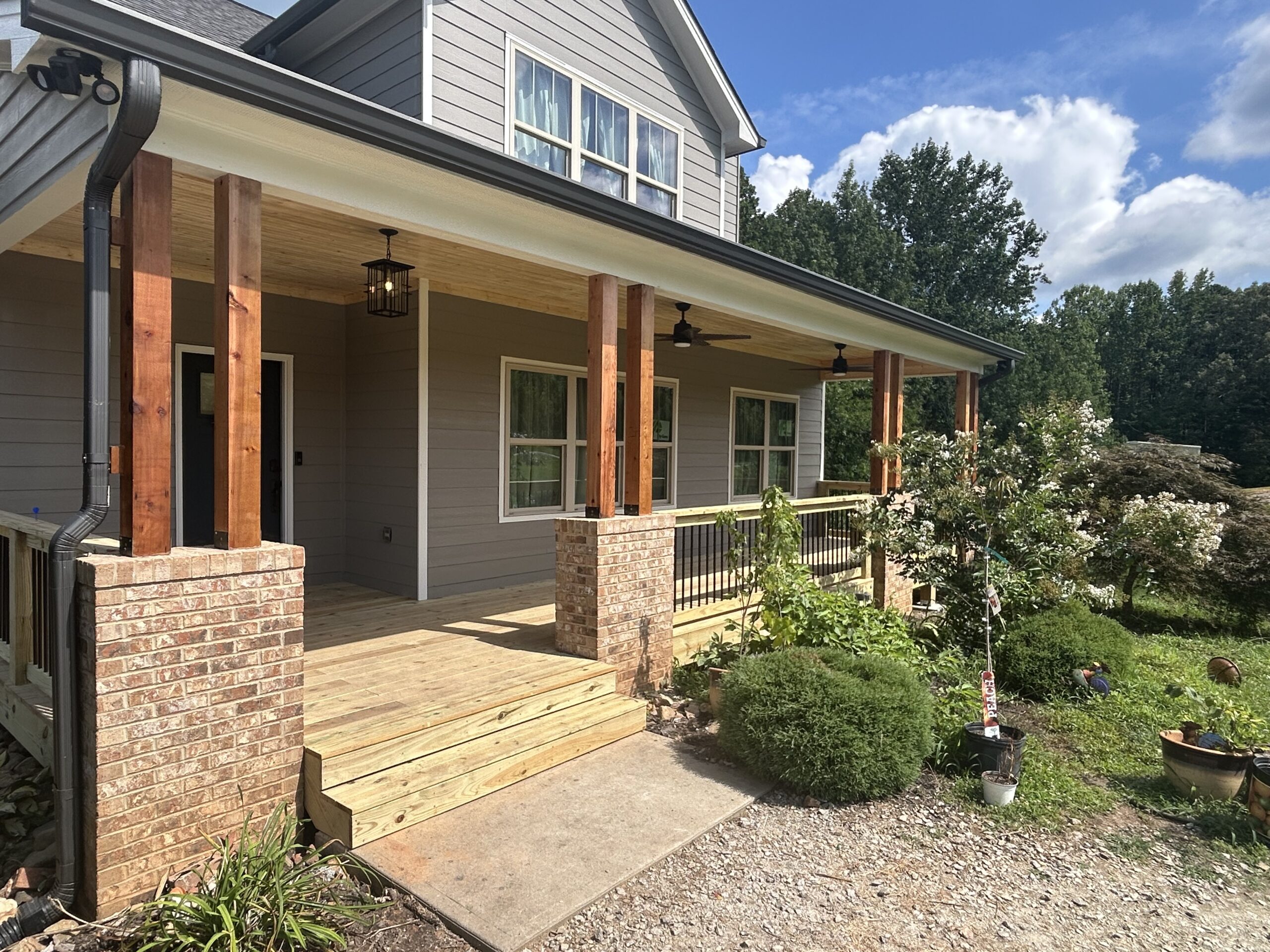 Homeowner called that their propane tank had caught on fire causing damage to the porch, ceiling, electrical and destroyed columns. We temporarily supported the roof and removed the existing deck, two windows, ceiling, electrical and siding. We built new 36’x8’ and 10’x4’ front porch, ran new electrical for two fans, one ceiling light, one outlet on the front of the deck and one wall outlet, installed tongue and groove ceiling, two custom windows, hardi lap siding and hardi trim, installed cedar 6×6 posts to support the roof and clear coated them, painted the siding under the roof as well as fascia, soffit, siding and trim on the outside due to the smoke damage, clear coated the ceiling and installed the ceiling fans, lights and flood lights.