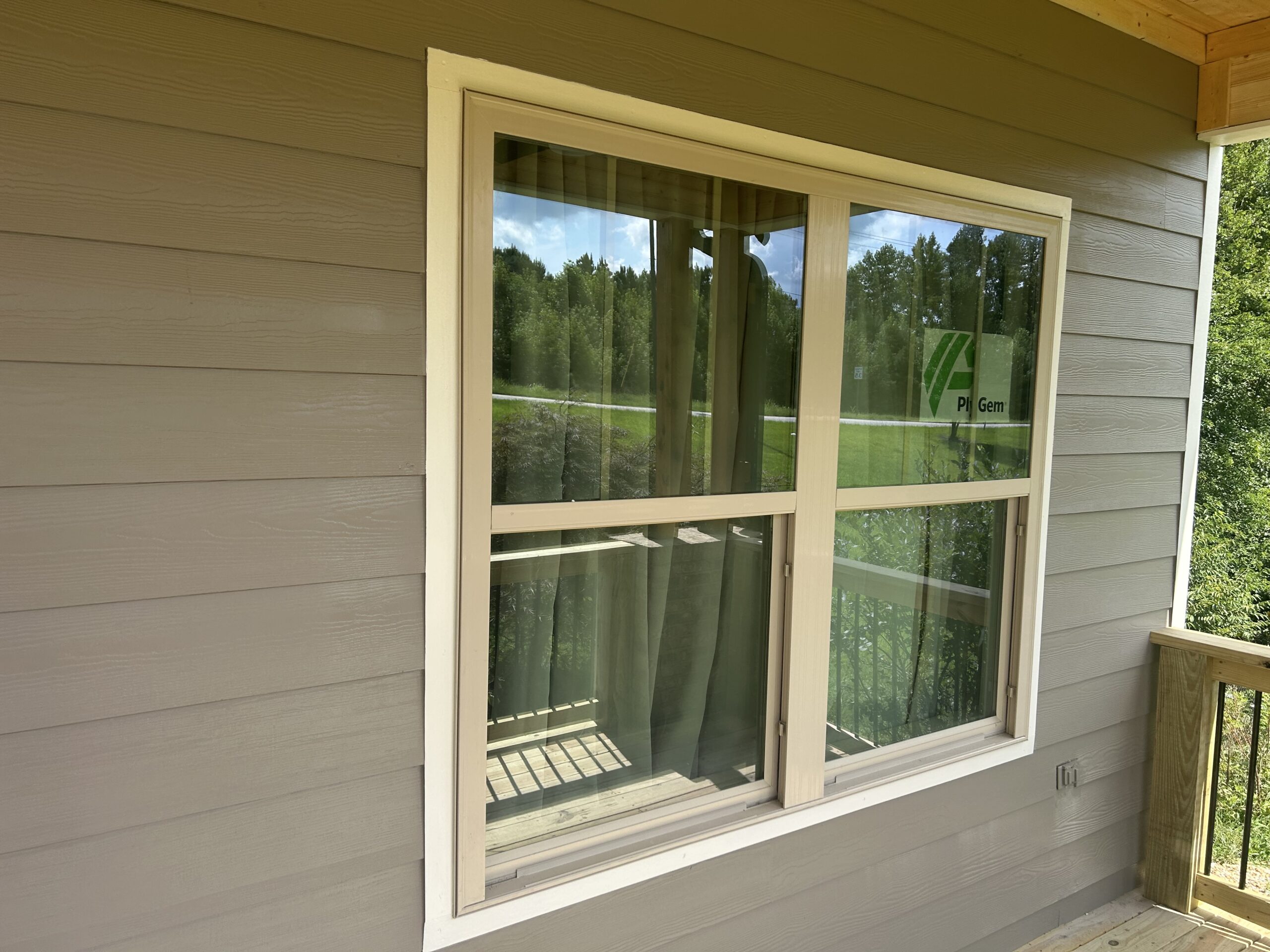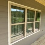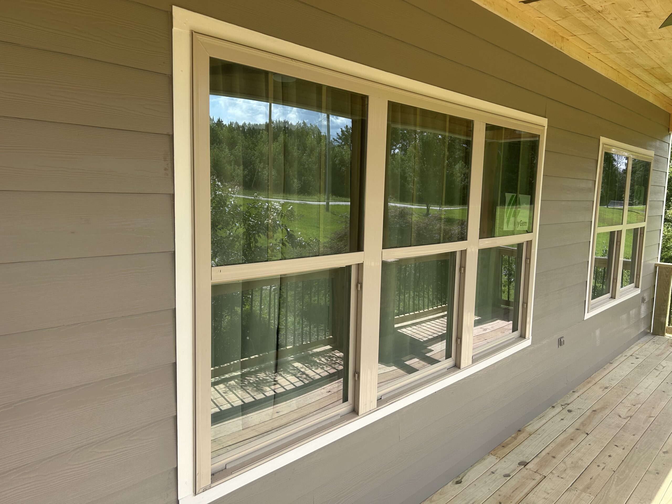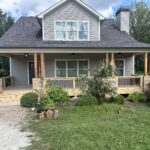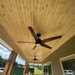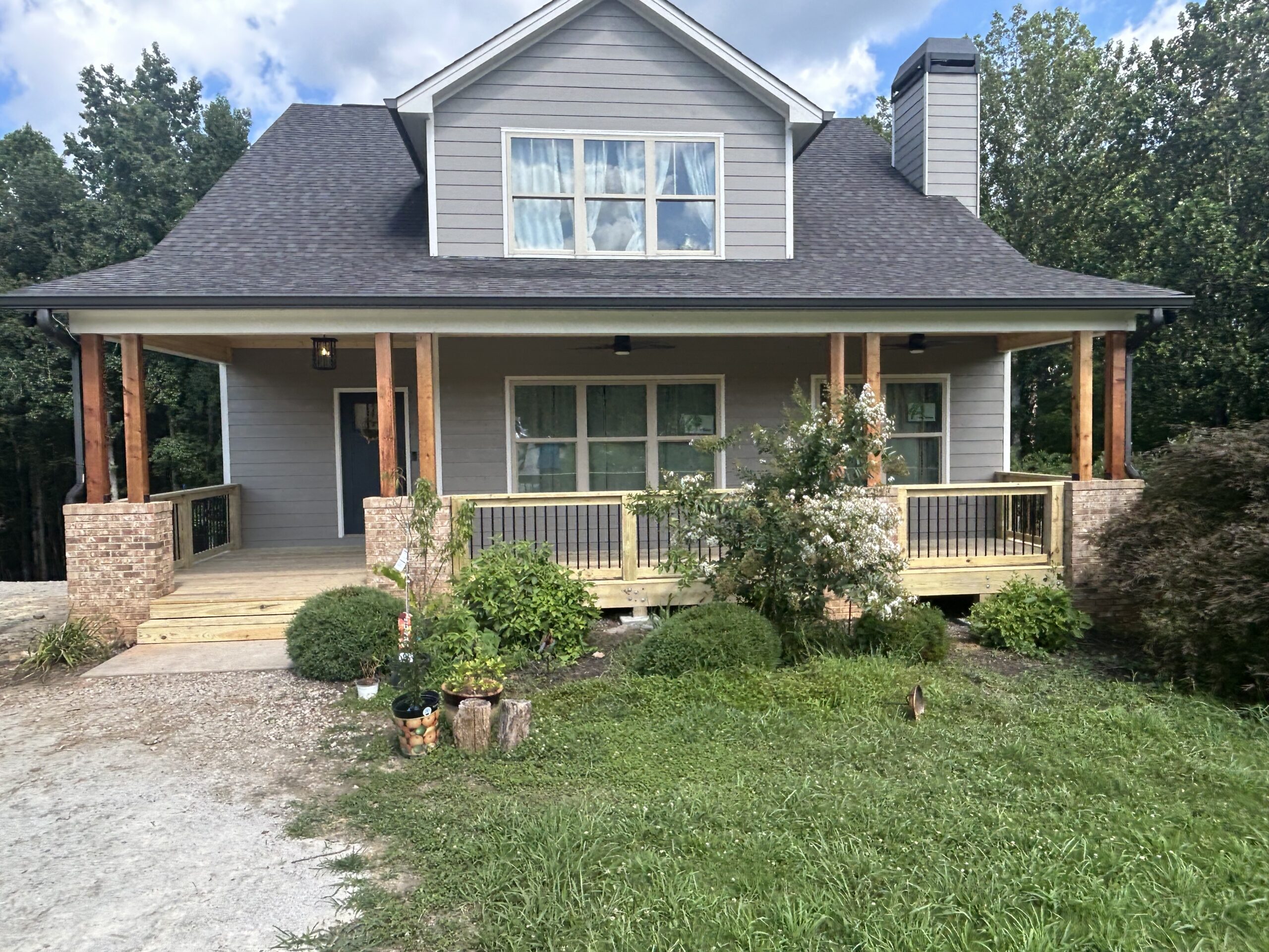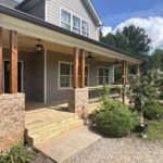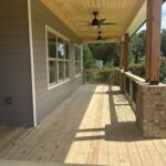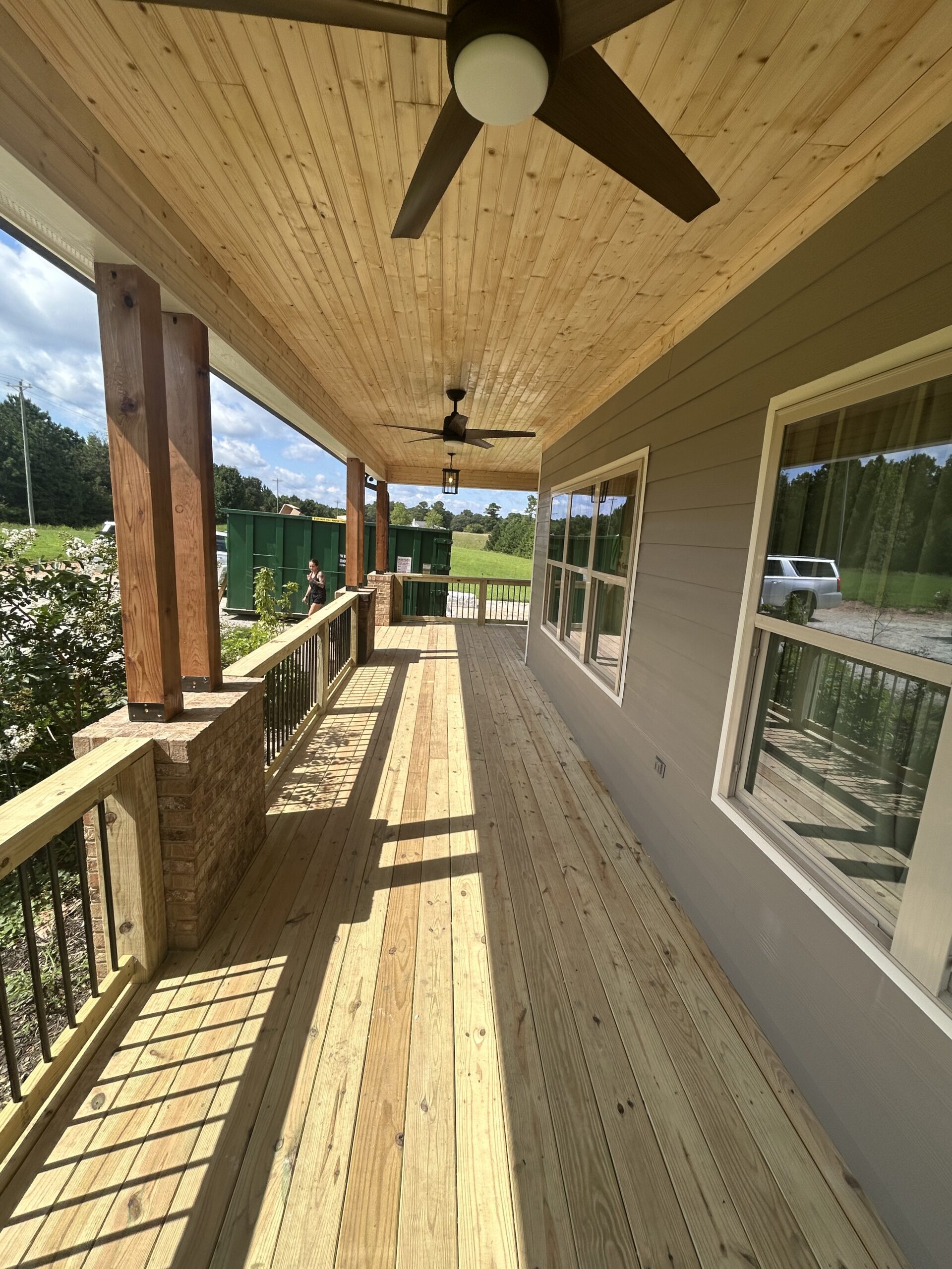 Homeowner called that their propane tank had caught on fire causing damage to the porch, ceiling, electrical and destroyed columns. We temporarily supported the roof and removed the existing deck, two windows, ceiling, electrical and siding. We built new 36’x8’ and 10’x4’ front porch, ran new electrical for two fans, one ceiling light, one outlet on the front of the deck and one wall outlet, installed tongue and groove ceiling, two custom windows, hardi lap siding and hardi trim, installed cedar 6×6 posts to support the roof and clear coated them, painted the siding under the roof as well as fascia, soffit, siding and trim on the outside due to the smoke damage, clear coated the ceiling and installed the ceiling fans, lights and flood lights.