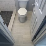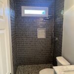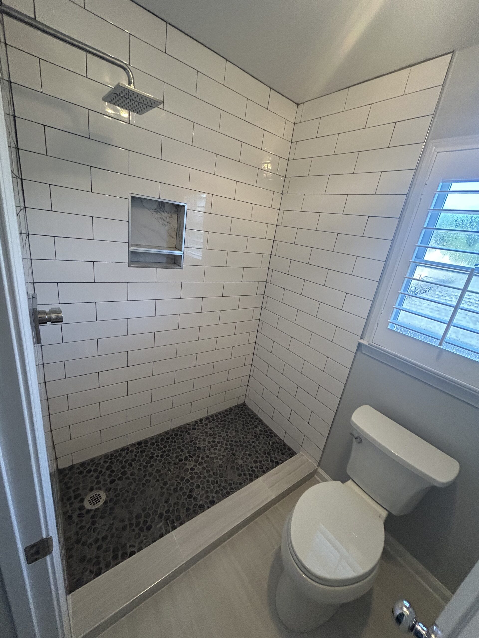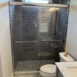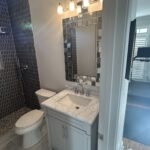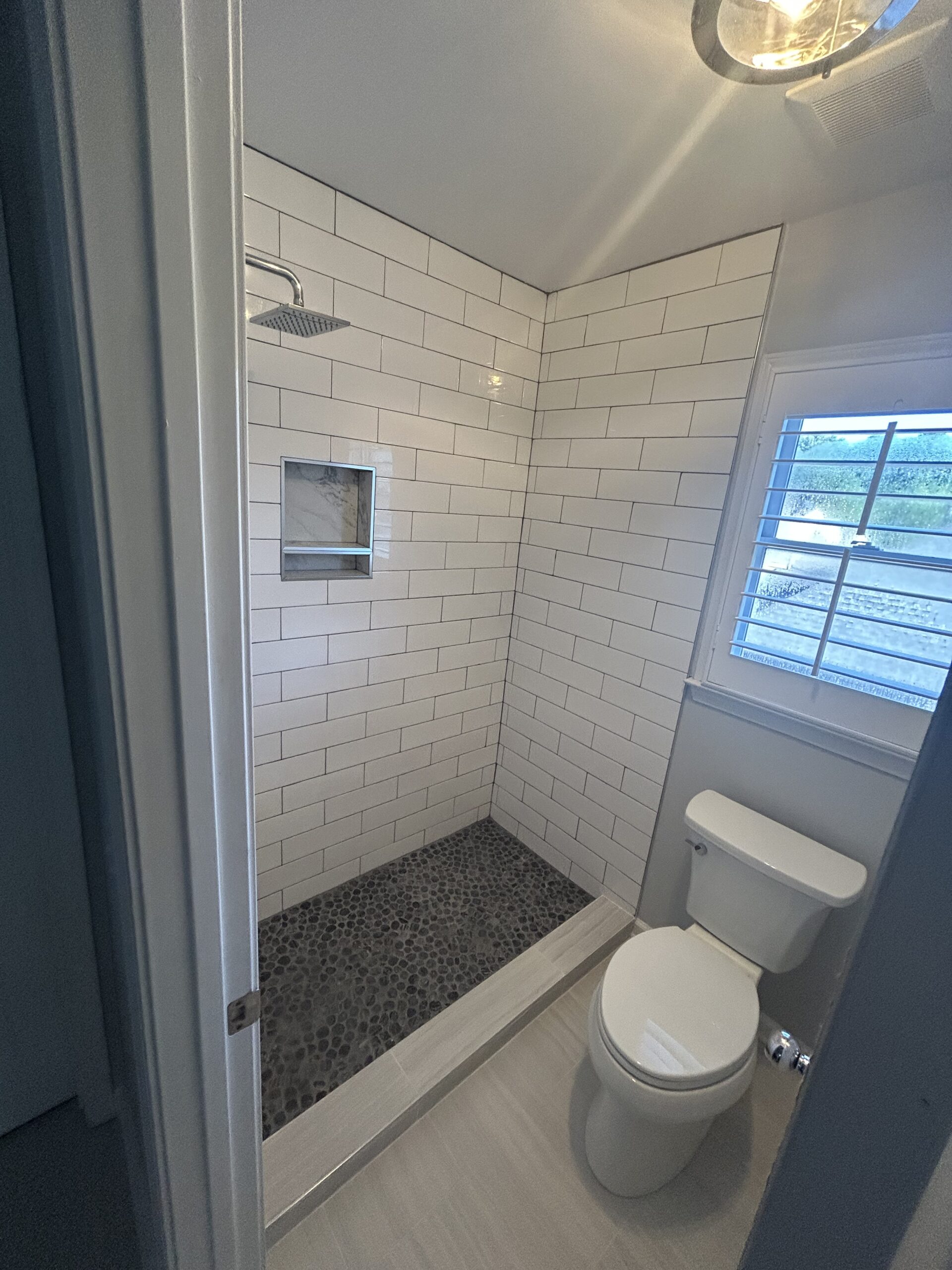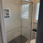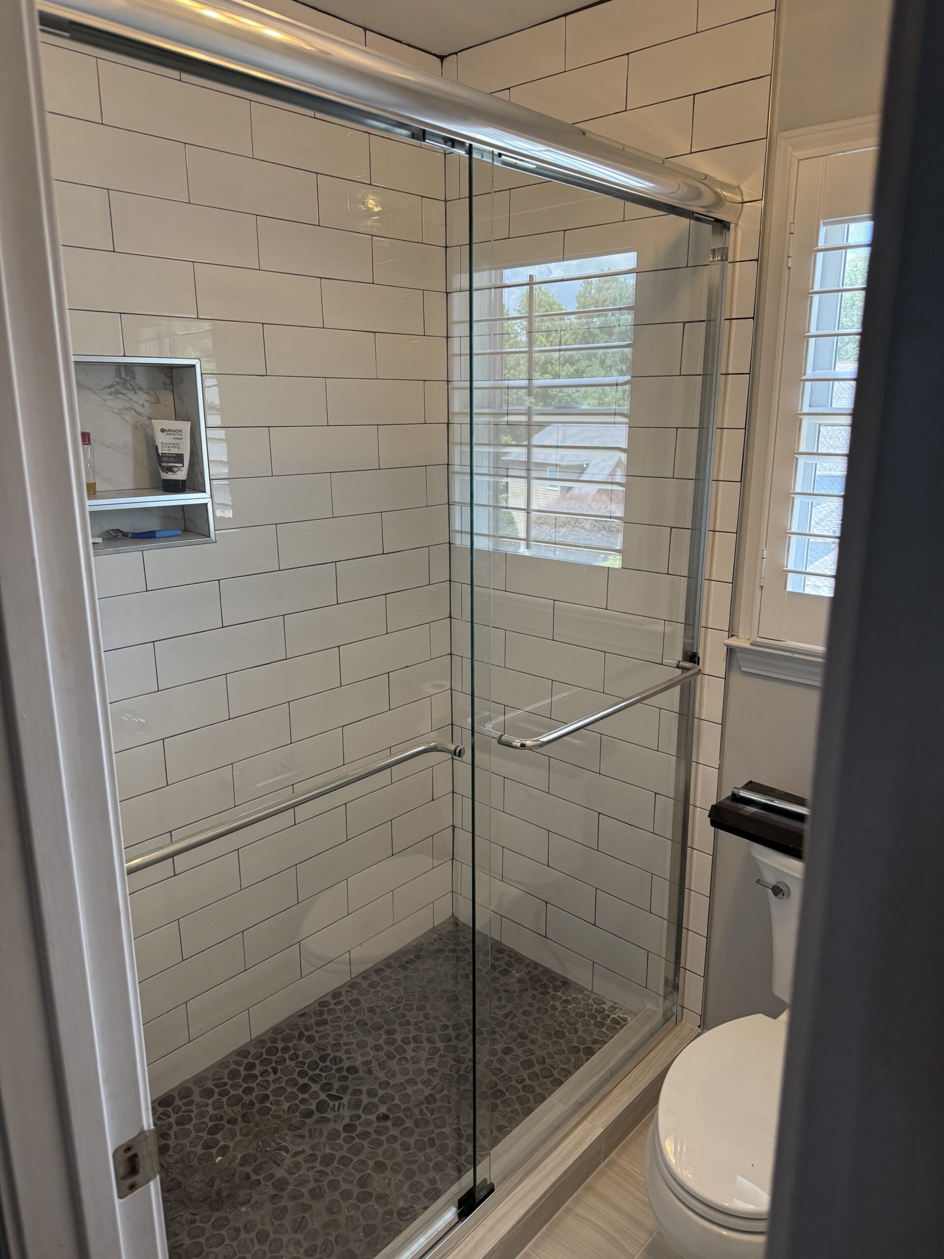 Removed tub/shower, vanity, flooring, toilet and mirror. Installed new shower faucet, custom pan, installed tile walls and floor in shower. Installed tile flooring in bathroom, new vanity, baseboards, new exhaust fan, wall light and toilet. Painted bathroom walls, ceiling and trim. Installed semi framed sliding glass doors in shower.