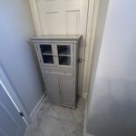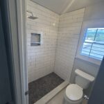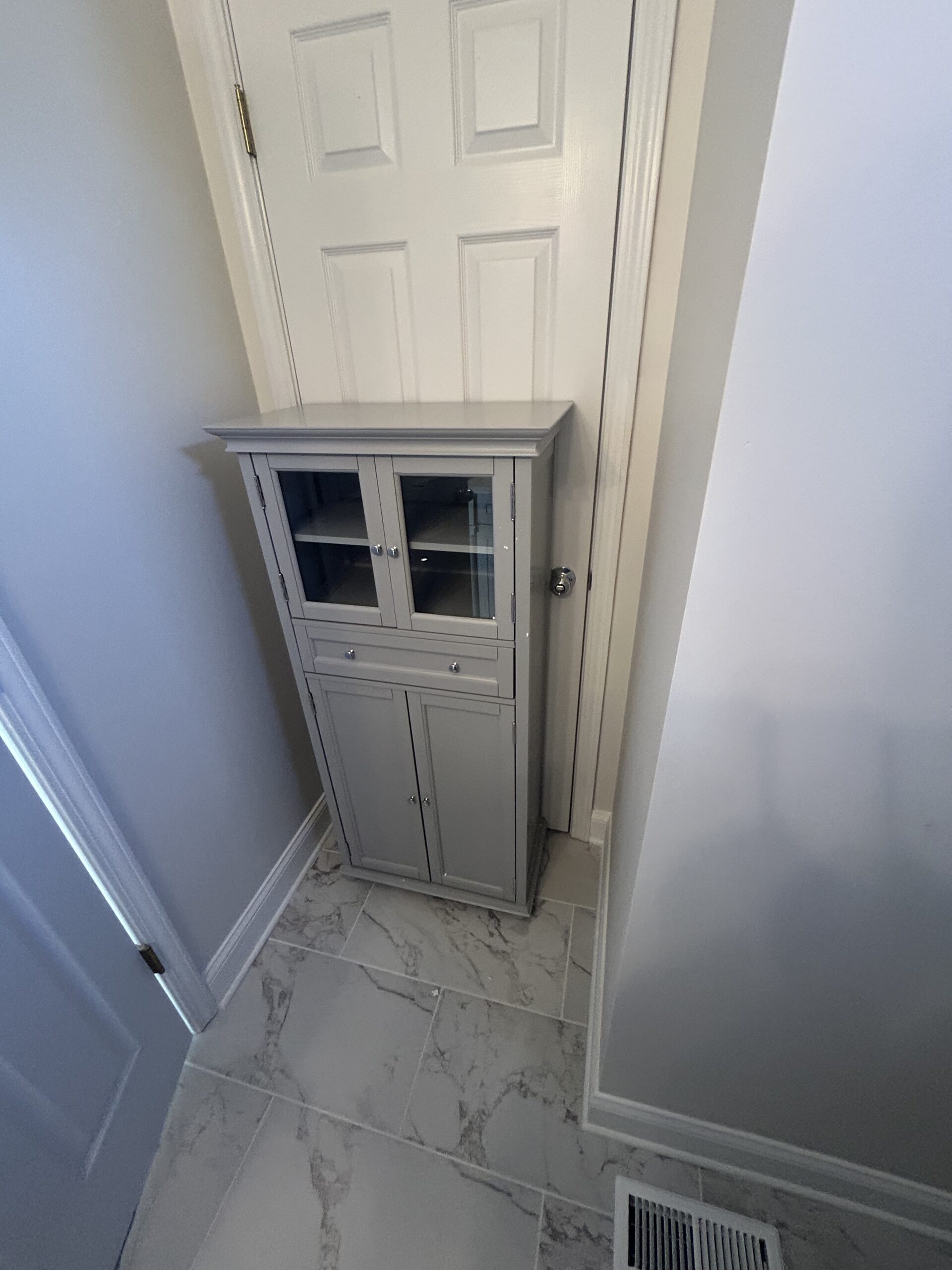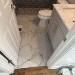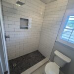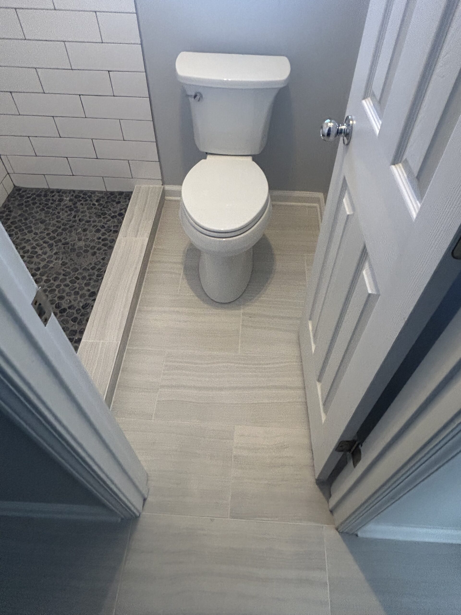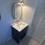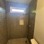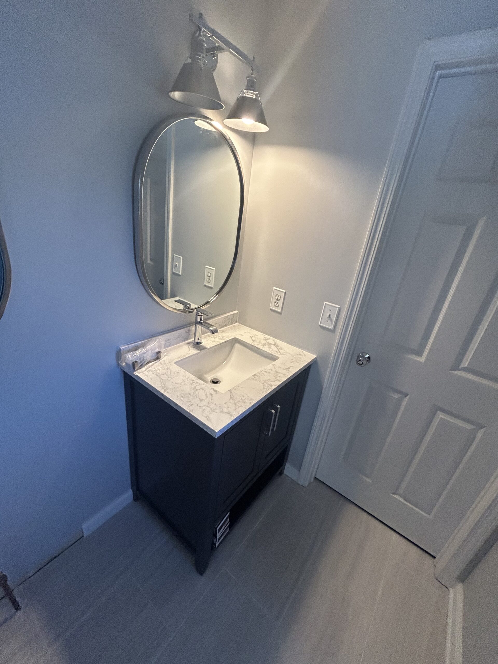 Removed tub/shower, vanity, flooring, toilet and mirror. Installed new shower faucet, custom pan, installed tile walls and floor in shower. Installed tile flooring in bathroom, new vanity, baseboards, new exhaust fan, wall light and toilet. Painted bathroom walls, ceiling and trim. Installed semi framed sliding glass doors in shower.