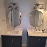 Removed tub/shower, vanity, toilet and flooring. Installed new shower faucet, tiled shower and floor, new vanities, exhaust fan, wall lights, baseboards and toilet. Painted walls, ceiling and trim. Installed semi framed glass doors in shower